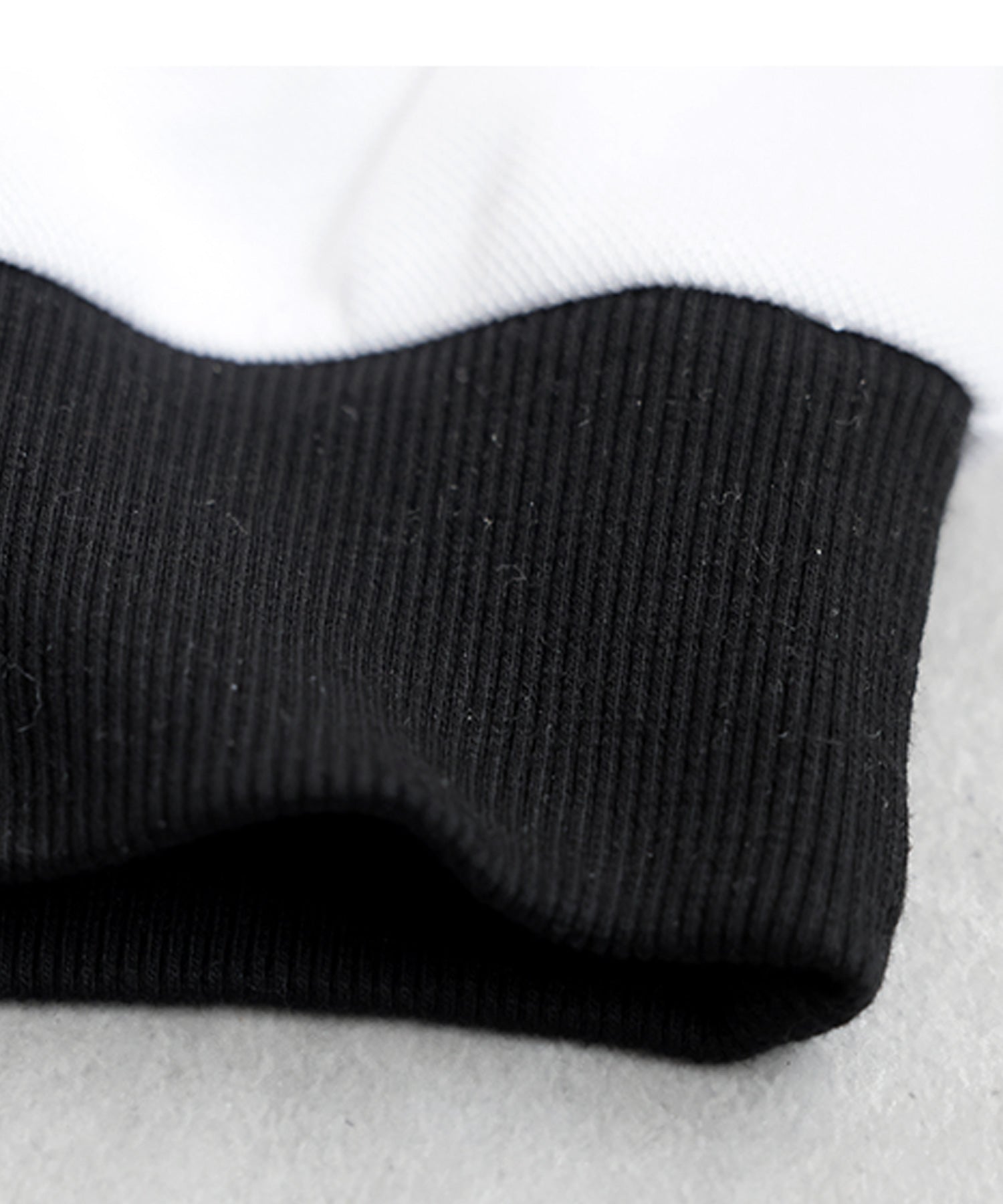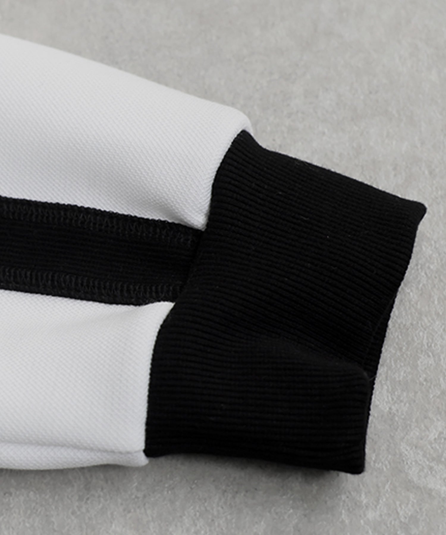 Body: 84% Polyester, 13% Rayon, 3% Polyurethane. Rib: 97% Polyester, 3% Polyurethane.